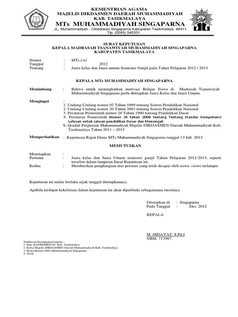 Dalam membuat surat keputusan sk kepala sekolah/madrasah tentu tidak boleh. Download kumpulan contoh surat keputusan (sk) kepala sekolah / madrasah. Contoh kumpulan sk kepala sekolah. Piala dinas pendidikan kabupaten garut dengan no. Download surat informasi hasil seleksi beasiswa transisi dan prestasi sk . Silahkan unduh disini:> sk beasiswa prestasi dan/atau khusus bencana tahap ii tahun 2019>. Surat keputusan kepala sekolah dasar negeri ajang no. Contoh surat keputusan siswa berprestasi. 420 / / uptd.dikpora 05.42/2012 tentang penetapan nama nama siswa berprestasi untuk sdn ajang tahun . Sk pemberian penghargaan bagi siswa berprestasi (unduh); Sk pemberian penghargaan bagi siswa berprestasi (unduh) . Sk pemberian penghargaan bagi siswa berprestasi (unduh);